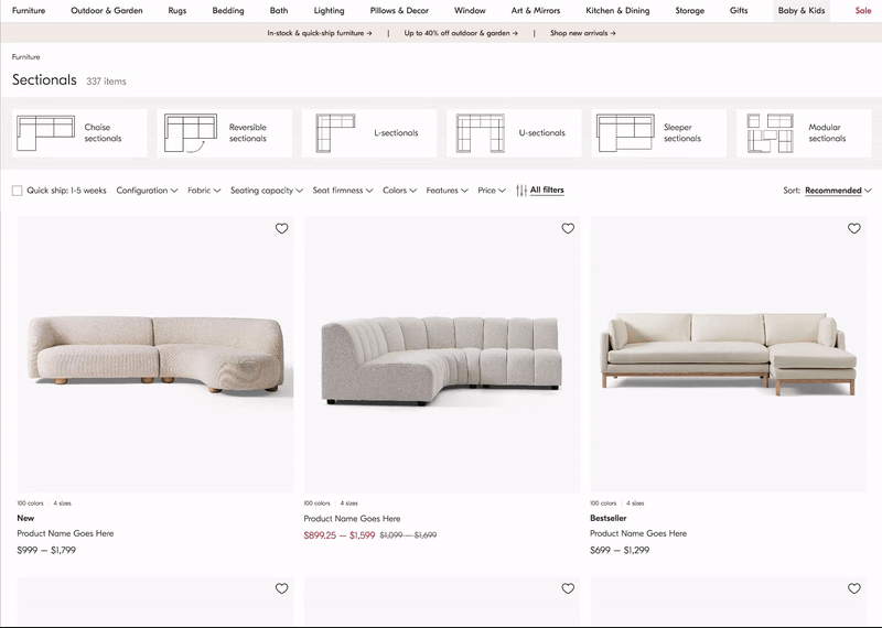 West Elm’s product cards were untouched for years and felt dated, so the team wanted a UI refresh to improve the look and feel of product list pages. More importantly, product info lacked a clear hierarchy, and it wasn’t easy to quickly scan and compare items.