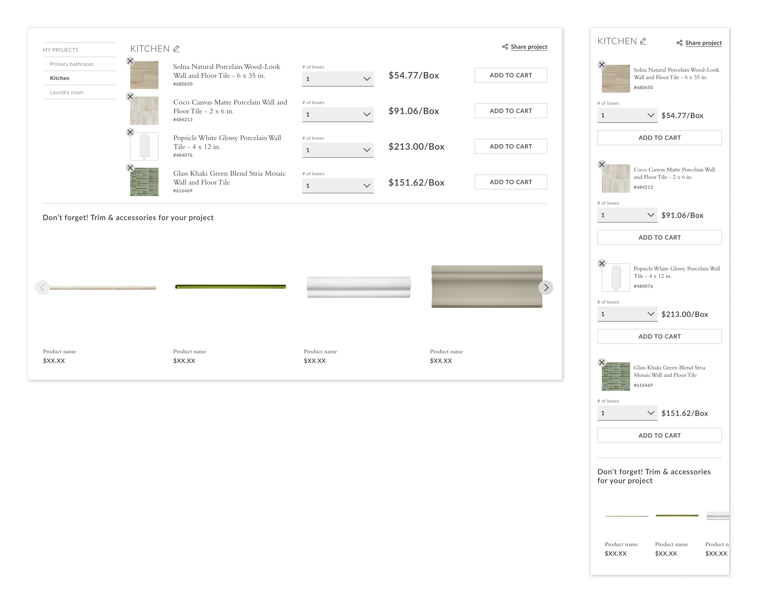 Tile Shop users were unable to save items they liked – and since tile tends to have a long consideration-to-purchase journey, this was a key area of opportunity to improve the site experience. Additionally, tile is often project-based, so I wanted to give users (particularly repeat customers) the ability to organize their saved items.